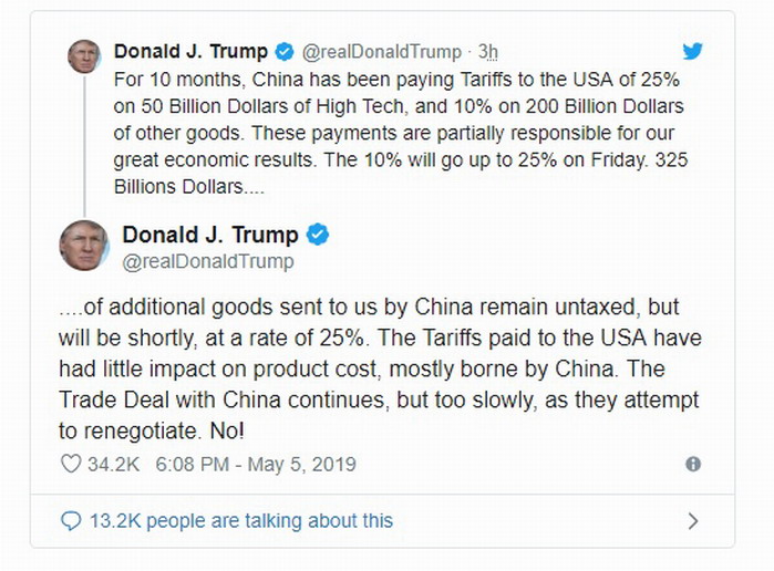 Theo nguồn tin từ CNBC, ông Trump sẽ đánh thuế 25% lên số hàng 200 tỷ USD của Trung Quốc (số hàng này đang bị đánh thuế 10%) vào thứ 6 tuần tới tức ngày 10-5-2019. Ngoài ra ông Trump tiếp tục cảnh cáo tăng thêm 25% lên số hàng còn lại 325 tỷ USD.
