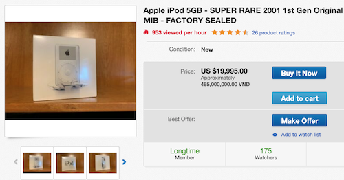 Một chiếc iPod thế hệ đầu tiên đang được rao bán trên eBay với giá 19.995 USD (khoảng 465 triệu đồng), cao gấp 50 lần so với mức giá 399 USD (khoảng 9,3 triệu đồng) khi sản phẩm lần đầu tiên được Steve Jobs giới thiệu vào 10/2001. Thiết bị này được đánh giá "rất hiếm" khi còn nguyên lớp nilon bọc bên ngoài (seal).