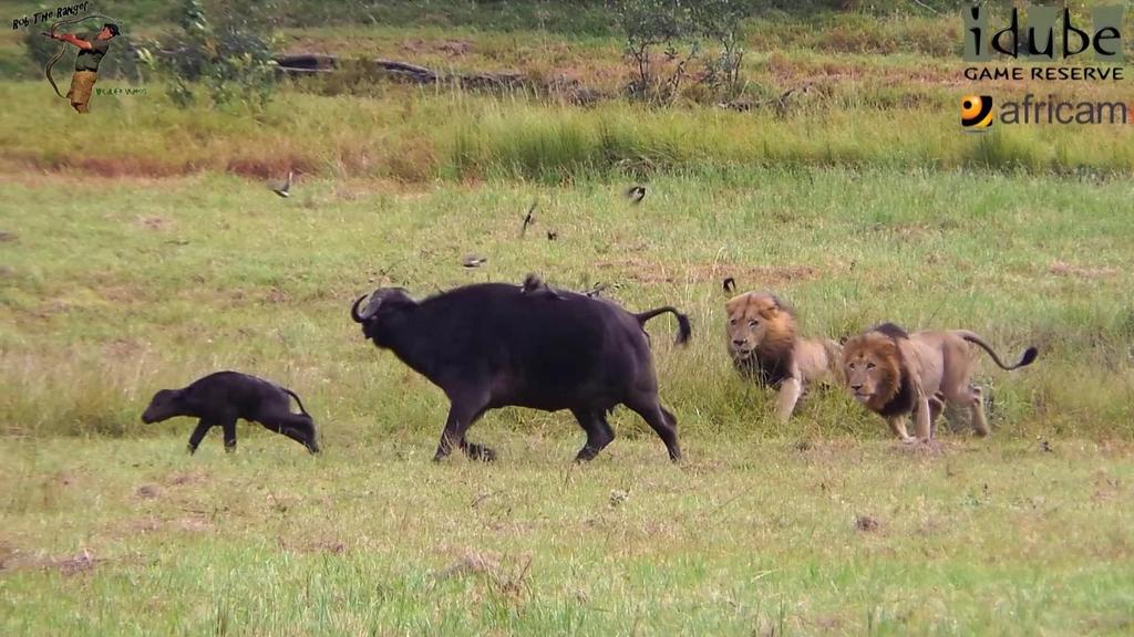 Hai con sư tử đực lao tới tấn công trâu mẹ và cố gắng vật ngã con mồi xuống đất, trong khi trâu con cố gắng bỏ chạy.