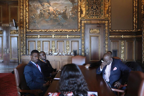 Các nhà hoạt động nhập cư Liberia từ trái sang: người lãnh đạo Erasmus Williams, Mục sư Francis Tabla và Kamaty Diahn hỏi các nhân viên tại sao cuộc họp của họ với Thống đốc bang Tim Timz bị hủy bỏ. Ảnh: Reuters.