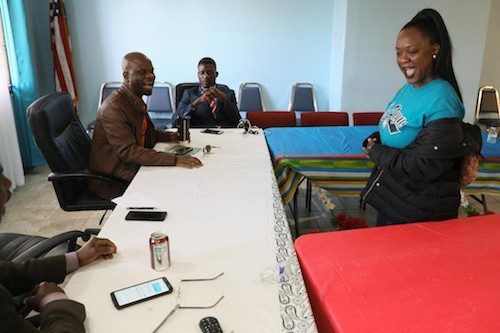 Những người người có thị thực DED và nhà hoạt động cộng đồng Liberia Famatta Zeon vui đùa với các nhà lãnh đạo cộng đồng trước khi cuộc họp của người Liberia với hội đồng bang Minnesota. Ảnh: Reuters.