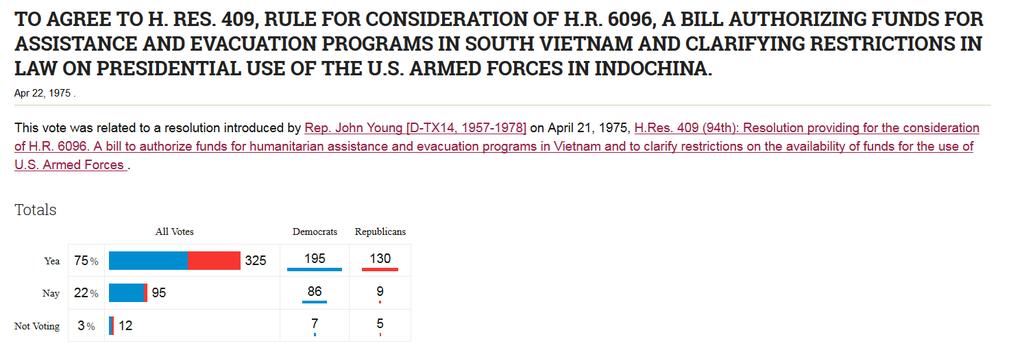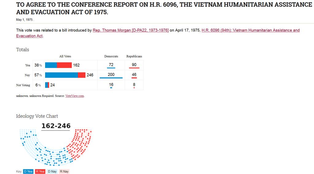 Dưới đây là những kết quả vote liên quan đến nhận người tị nạn VN năm 1975 (màu xanh DC ,màu đỏ CH):