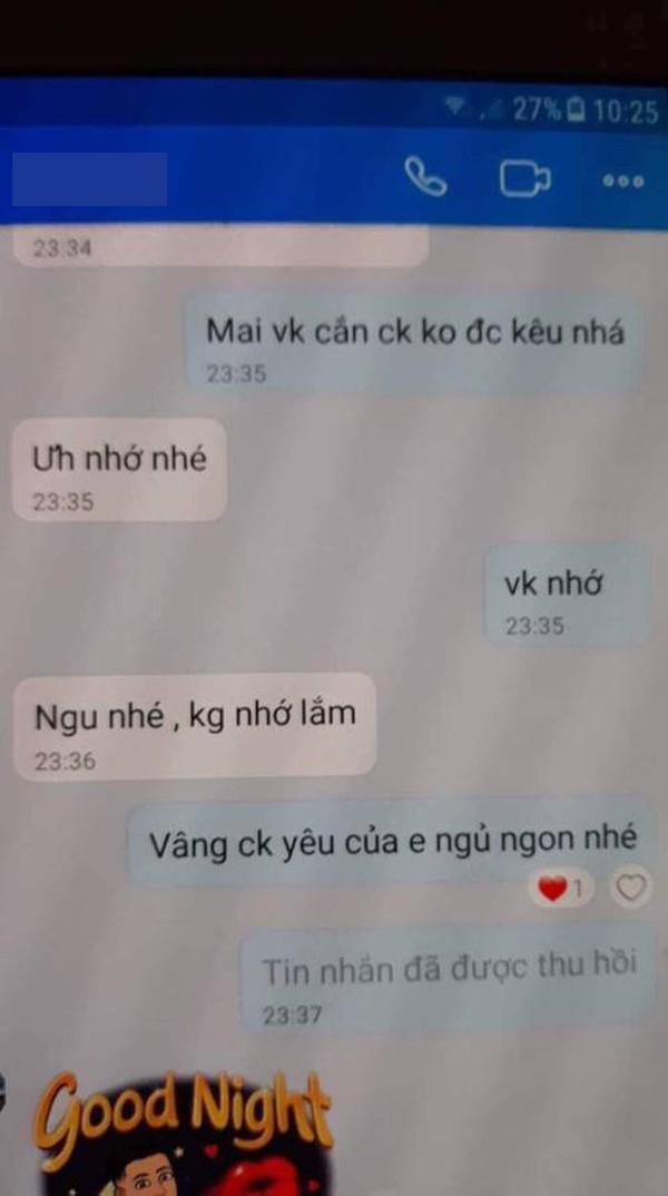 Theo anh L. chi biết, bản thân phát hiện vợ mình có quan hệ ngoài luồng với đồng nghiệp từ cách đây hơn 2 năm và thấy nhiều tin nhắn xưng vợ chồng nên đã bí mật theo dõi.