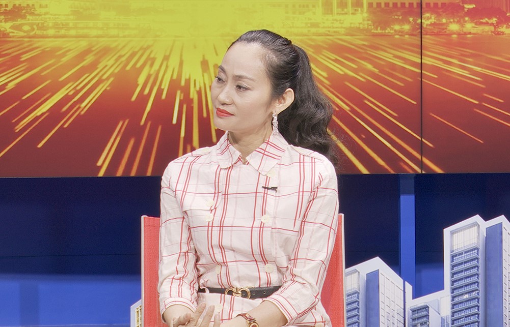 Hạnh Thúy trong một talk show do Quyền Linh dẫn chương trình.