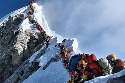 Trên đỉnh Everest hiện có rất nhiều người khiến việc di chuyển rất khó khăn. Hai du khách đã bị đột tử vì hiện tượng này. Một hướng dẫn viên cho rằng dòng người leo núi xếp hàng lên đỉnh Everest đã khiến một nữ du khách tử vong trên nóc nhà thế giới.