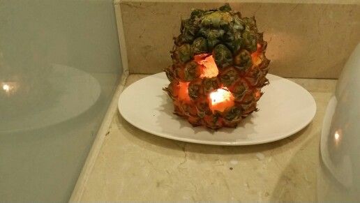Sự kết hợp giữa quả dứa và nến sẽ mang đến cho bạn một hương thơm dễ chịu, lan tỏa khắp phòng mà lại sử dụng được lâu nữa. Đầu tiên, sau khi mua quả dứa về, bạn không gọt vỏ mà cắt ngang đầu quả thơm, lấy hết phần ruột vàng ra. Với phần vỏ còn lại, bạn đặt nến vào trong, toàn bộ cây nến phải bên trong trái thơm. Hoặc bạn cũng có thể gọt thơm theo hình bên dưới.