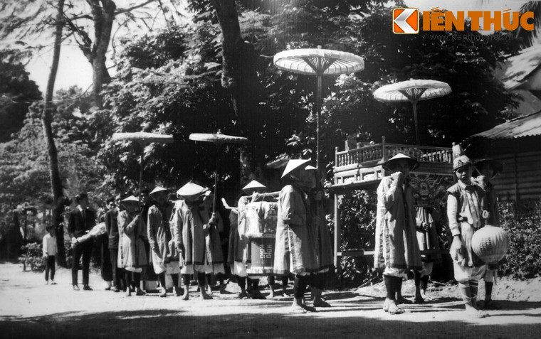Đoàn rước dâu của đám cưới ở Huế giữa thế kỷ 20. Hình ảnh chụp lại từ Bảo tàng Văn hóa Huế.