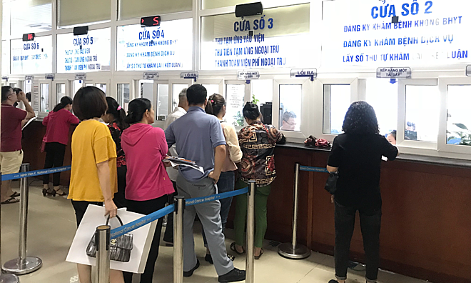 Bệnh nhân, thân nhân người bệnh xếp hàng trước quầy thu phí Bệnh viện K Trung ương, Hà Nội. Ảnh: Hà Trần.