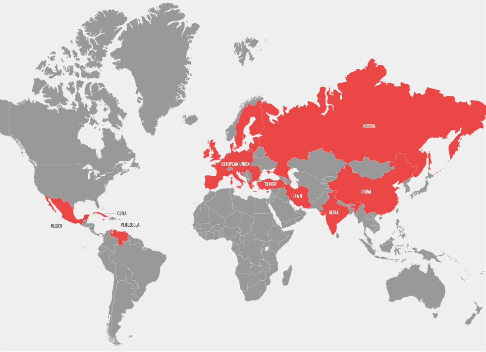 Chỉ trong một ngày 30/5, tổng cộng 32 quốc gia (bao gồm các nước thành viên EU) đã bị đe dọa hoặc đối mặt với các lệnh trừng phạt từ Mỹ.