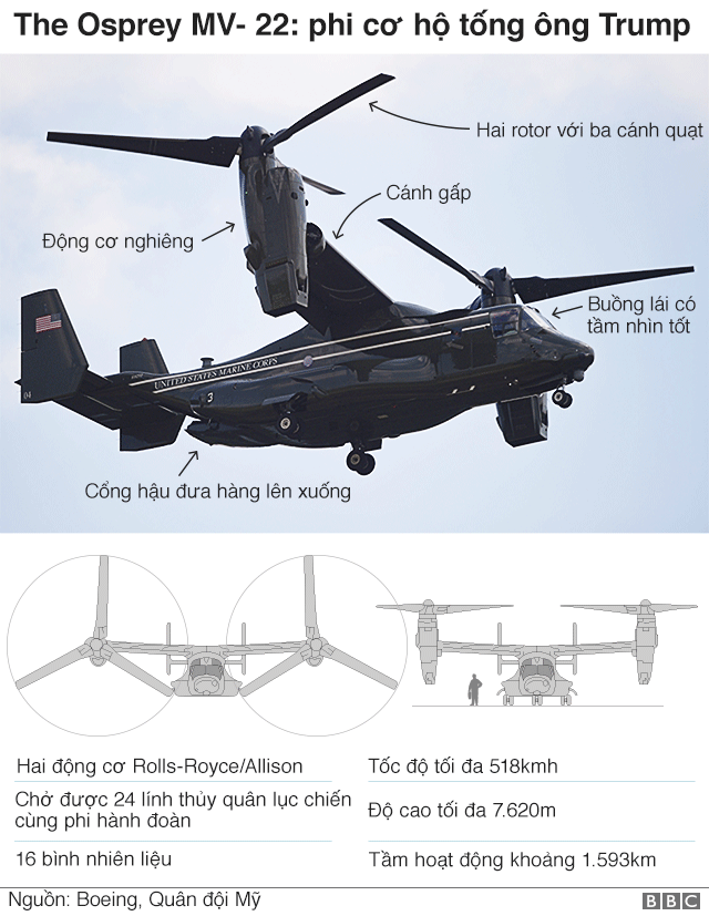 Nó cũng thường được hộ tống bởi hai hoặc ba chiếc phi cơ Osprey MV-22, được gọi là 'thân trên xanh' (green tops).