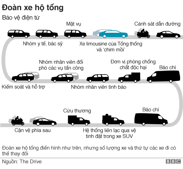 Khi tới nơi, tổng thống sẽ đi trên chiếc Cadillac One, chiếc xe có biệt danh 'The Beast' (Quái Thú).