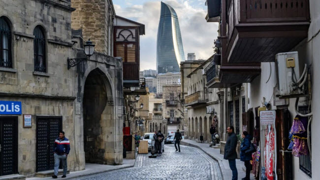 Tòa nhà hình ngọn lửa gần khu phố cổ ở thành phố Baku, Azerbaijan.