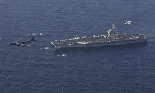 "Oanh tạc cơ chiến lược B-52H và Không đoàn trên hạm số 7 (CVW-7) thuộc nhóm tác chiến tàu sân bay USS Abraham Lincoln đã tham gia diễn tập chung hôm 1/6 tại khu vực phụ trách của Bộ Tư lệnh Trung tâm Mỹ (CENTCOM). Các hoạt động diễn tập gồm bay theo biên đội và tấn công giả định", Bộ Quốc phòng Mỹ hôm qua ra thông cáo cho biết.