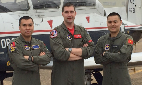 Đây chính là 2 phi công sắp hoàn thành khóa huấn luyện ở Mỹ. Hai sĩ quan Việt Nam chuẩn bị tốt nghiệp khóa đào tạo trên máy bay huấn luyện sơ cấp T-6 thuộc Chương trình Lãnh đạo Hàng không của Mỹ.