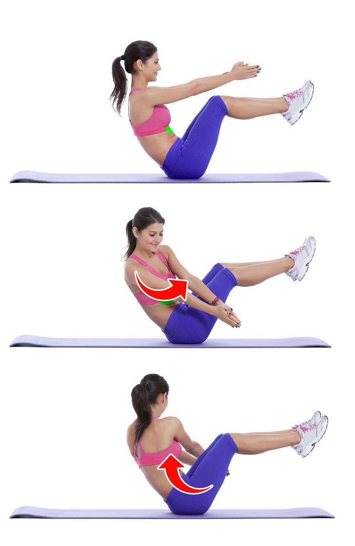 Nhấc chân tạo thành tư thế chữ V:Bài tập này có thể hơi khó, nhưng nó đặc biệt hiệu quả. Bạn chỉ cần nhấc cơ thể lên và cân bằng chân và tay cùng 1 lúc. 1-Nằm xuống, duỗi cánh tay lên quá đầu. Lòng bàn tay nên hướng xuống. Chân thẳng. 2-Từ từ nâng toàn bộ chân và tay theo hình chữ V. 3-Cố gắng chạm ngón tay vào ngón chân. 4-Từ từ trở lại tư thế ban đầu. Thực hiện 3 lượt, mỗi lượt 10-15 lần