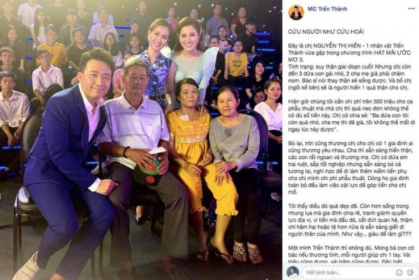 Trên trang cá nhân, Trấn Thành đăng tải dòng trạng thái kêu gọi mọi người ủng hộ chị Nguyễn Thị Hiền, một nhân vật trong chương trình Hát mãi ước mơ mà anh tham gia. Ông xã Hari Won chia sẻ câu chuyện của chị Hiền với tình trạng suy thận giai đoạn cuối nhưng có đến 3 con gái nhỏ và cha mẹ già cần chăm nom. Dù gặp phải tình huống khó khăn nhưng chị Hiền được gia đình thương yêu hết mực. Cha chị sẵn sàng hiến thận trong khi các con ngoan ngoãn nghe lời mẹ.