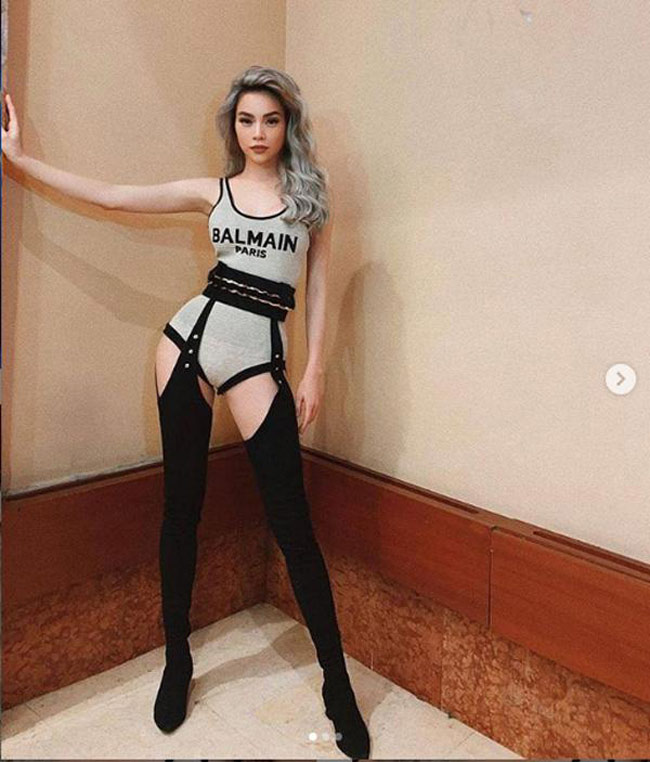 Thiết kế áo bơi của Balmain kết hợp với tất nối đai quần khiến Hà Hồ cực kỳ sành điệu dưới ánh đèn sân khấu.
