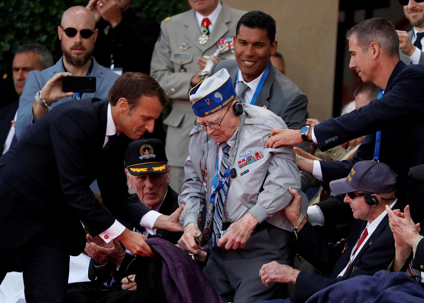 Tổng thống Pháp Emmanuel Macron đỡ một cựu chiến binh ngồi xuống trong buổi lễ. Ảnh: New York Times.