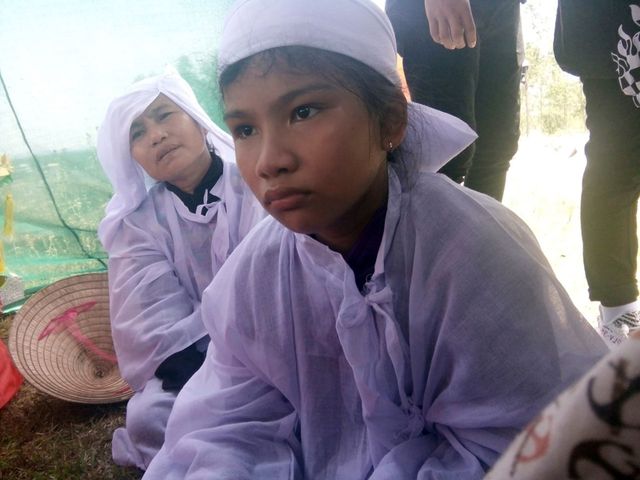 Cháu Trần Hoàng Huyền Thương (12 tuổi, học sinh lớp 6) ngồi thẫn thờ trong đám tang mẹ.