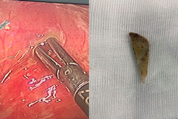 Qua chụp cắt lớp vi tính, bác sĩ chẩn đoán có dị vật trong lòng ruột non, nghi do mảnh xương. Sau đó, bệnh nhân được các bác sĩ khoa Phẫu thuật ống tiêu hoá nội soi lấy dị vật, là mảnh xương dài 5 cm, rộng 1 cm. Phần ruột non bị thủng đã được khâu kín.