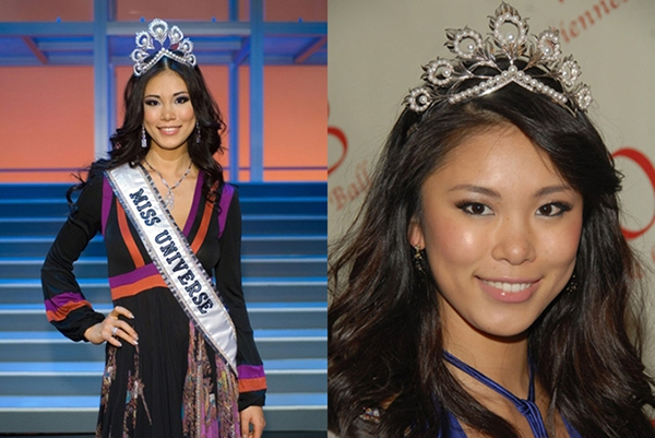Trước đó, Miss Universe 2007 Riyo Mori năm 2007 cũng thường xuyên sử dụng vương miện bản sao (phải) sau khi đăng quang. Tất cả hoa hậu đều được ban tổ chức trao món quà này như một phần thưởng để giữ lại sau khi kết thúc nhiệm kỳ.