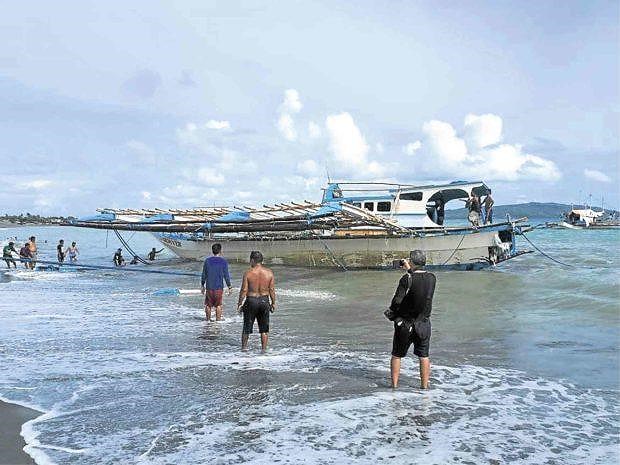 Ngư dân kiểm tra thiệt hại đối với tàu FB Gem-Vir 1, được các thợ lặn của Hải quân Philippines trục vớt sau khi nó chìm vào ngày 09-6 ở Biển Đông. Ảnh: Inquirer