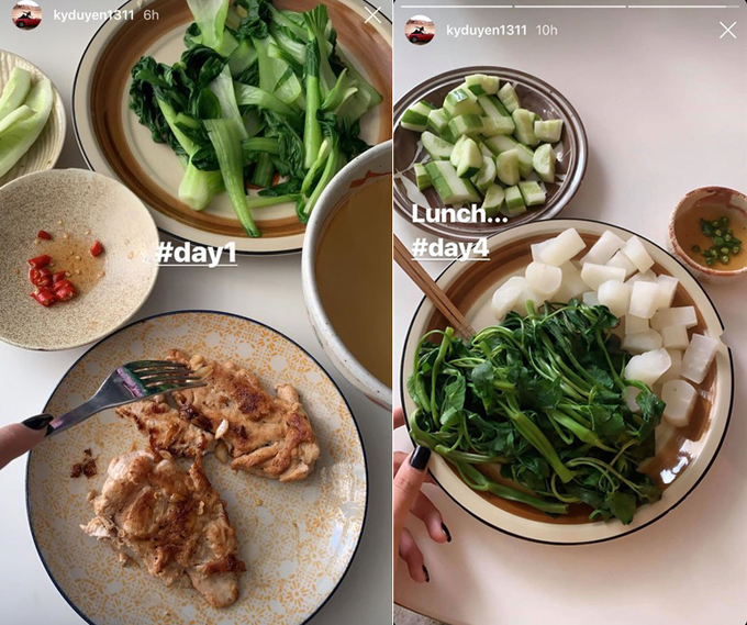 Nàng hậu thú nhận đang phải "bóp mồm, bóp miệng", ngày ăn hai bữa toàn rau xanh như trong hình để bù lại những ngày ăn uống thỏa thích vừa qua. Kỳ Duyên chia sẻ trên trang cá nhân: “Hôm nay là ngày thứ 6 “bóp mồm, bóp miệng”, ngày nào cũng chỉ 2 bữa như này thôi… sắp không còn là gấu béo nữa rồi. Thôi bù lại những ngày trước khi đi race (tham gia Cuộc đua kỳ thú- PV) ăn uống phủ phê để có sức tập nhé! Quyết tâm lắm rồi đó”.
