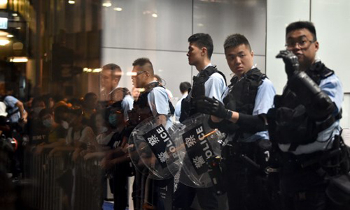 Cảnh sát Hong Kong bảo vệ trụ sở hôm 21/6. Ảnh: AFP.