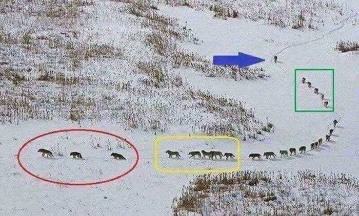 Ba con sói đi đầu (Khoanh đỏ) là những con già hay bệnh. Đây là những con chậm chạp nên đi đầu với mục đích là tạo & tốc độ di chuyển cho bầy sói. Mục đích chính là không có con nào bị bỏ rơi trong tình huống bầy sói bị tấn công.