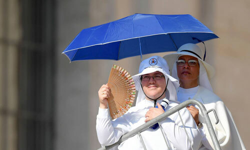 Các nữ tu đội mũ, che ô trong nắng nóng ở Vatican, Italy. Ảnh: AFP.