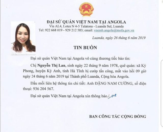 Đại sứ quán Việt Nam tại Angola phát tin buồn về vụ lao động bị sát hại.