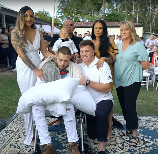 Navar (ngồi xe lăn), vợ Maia (bìa trái) cùng con trai Kyrie và người thân trong đám cưới được tổ chức ở Queensland hôm 24/6. Ảnh: FB.