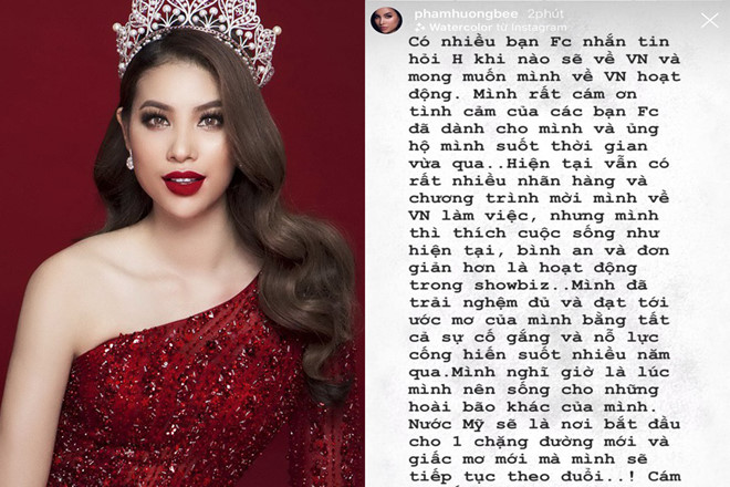 “Mình đã trải nghiệm đủ và đạt tới ước mơ của mình bằng tất cả sự cố gắng và nỗ lực cống hiến suốt nhiều năm qua. Mình nghĩ giờ là lúc nên sống cho những hoài bão khác của mình. Nước Mỹ sẽ là nơi bắt đầu cho một chặng đường mới mà mình sẽ tiếp tục theo đuổi. Cảm ơn tất cả các bạn đã luôn quan tâm và yêu thương mình", cô nói thêm.