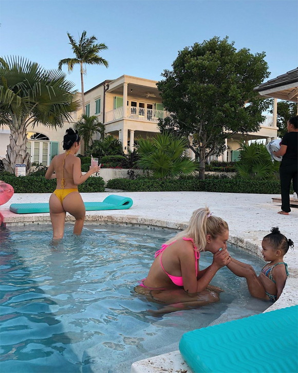 Kylie (mặc bikini vàng) mang theo con gái Stormi (bên phải) đi cùng trong chuyến du lịch. Là một doanh nhân bận rộn nhưng Kylie luôn cố gắng dành thời gian cho con và cân bằng cuộc sống của chính mình.