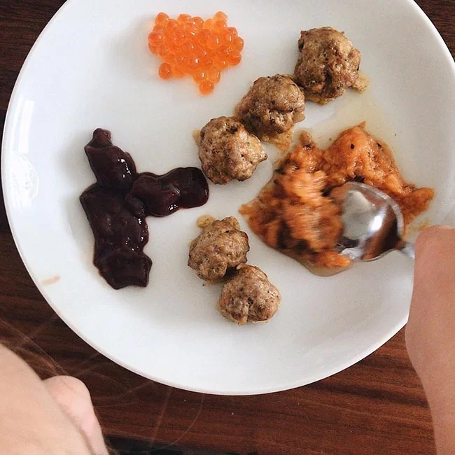 Bữa trưa của Isaac có gan bò sống, thịt viên, trứng cá hồi và khoai lang nghiền cùng nước xương.