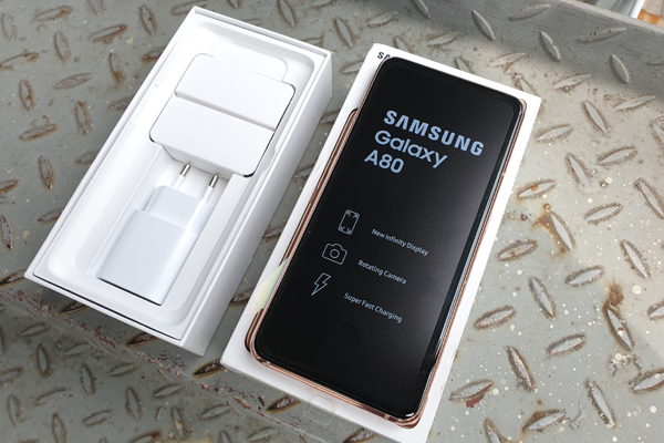 Mở hộp Galaxy A80 lại có một cách khác để làm tăng diện tích màn hình, đó là sử dụng cơ chế camera xoay trượt, trong khi phụ kiện đi cùng với Galaxy A80 gồm củ sạc, cáp sạc, tai nghe, ốp lưng và một tấm dán màn hình được dán sẵn trên máy, bởi iPhone X sử dụng màn hình “tai thỏ”, Galaxy S10 dùng màn hình khoét lỗ.