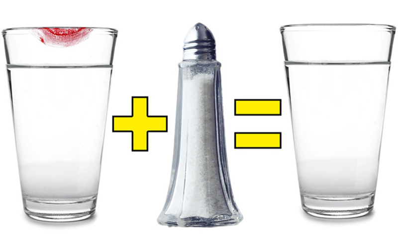 Rửa sạch vết son trên cốc thủy tinh: Việc các chị em uống nước và để lại vết son trên miệng cốc rất phổ biến. Nhưng nhiều loại son không phai rất khó rửa sạch. Với trường hợp này, bạn nên thử dùng muối sát nhẹ lên vết son và rửa lại.