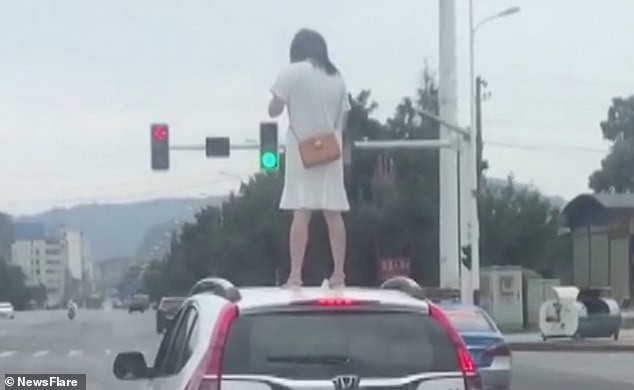 Theo đó, vào thời điểm trên, một người phụ nữ họ Ma và chồng họ Long đang lái xe di chuyển trên đường thì xảy ra cãi vã. Sau đó, trong lúc xe dừng lại chờ đèn đỏ thì người phụ nữ bất ngờ bước xuống xe rồi leo lên nóc xe ô tô đứng. Chưa dừng lại, người phụ nữ vừa đứng giậm chân, vừa liên tục chửi bới chồng ngồi bên dưới.