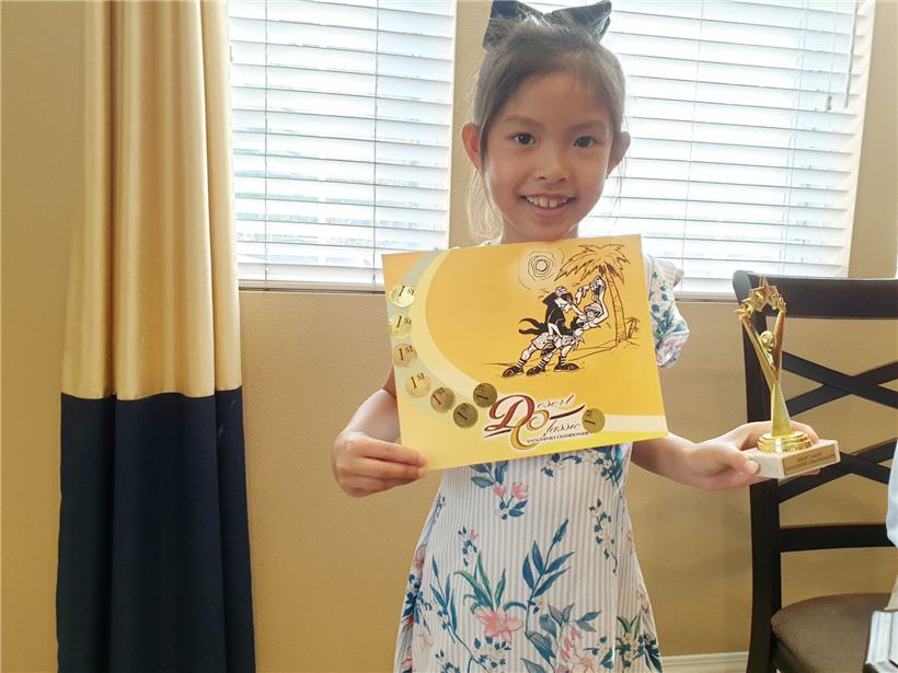 Kara khoe một giải nhất về khiêu vũ bé đoạt được. (Hình: Đằng-Giao/Người Việt)