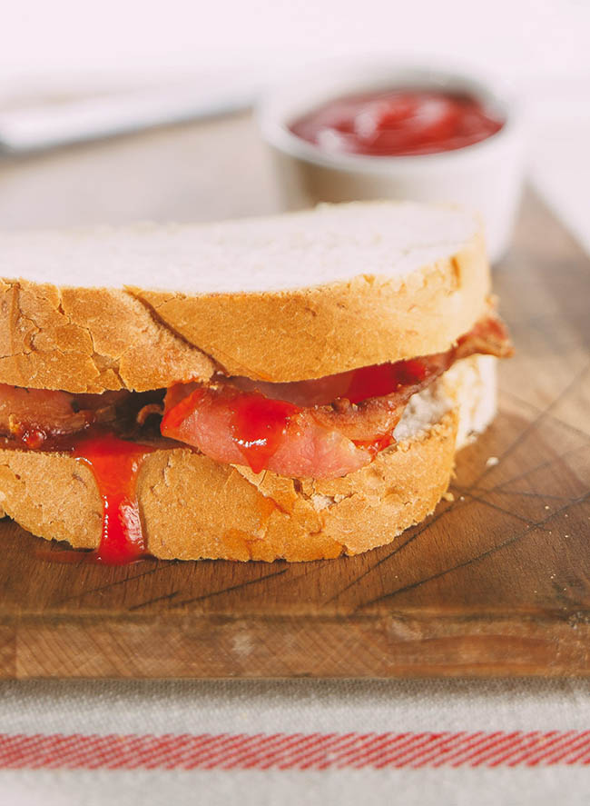 Món ăn này không có gì đặc biệt về hình thức, nhưng nó thật sự rất ngon. Đây là món ăn sáng yêu thích có mặt hầu hết trên khắp nước Anh. Một chiếc bánh chuẩn là bánh mới nướng thơm phức, giòn tan kẹp thịt xông khói vừa chiên chín tới.
