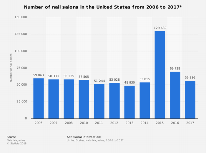 Nhân viên tiệm nail 80% nữ, 3/4 người gốc Á, và hầu hết ở độ tuổi 25 đến 44. Năm 2013, 48.900 tiệm nail đã đăng ký hoạt động tại Hoa Kỳ. Lượng tiệm nails tăng lên 56.300 vào năm 2017, tương đương với năm 2006.