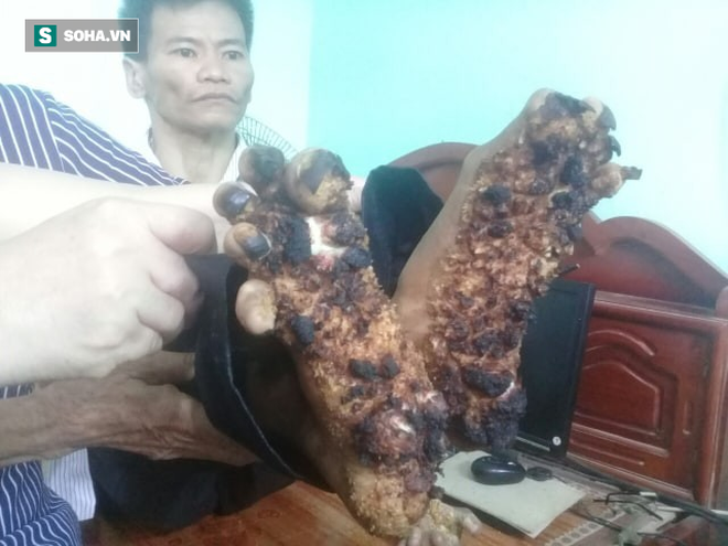 Nhưng cục thịt ấy đã không biến đi. Cục thịt tiếp tục tăng trưởng từng ngày, hàng loạt những mụn cóc bật lên xung quanh, rồi phát triển ở cả 2 chân và 2 tay, trông xù xì biến dạng giống hệt như vỏ cây xà cừ. Bà Vay kể với chúng tôi rằng, vào thời điểm đó những mụn cóc trông rất khó coi, mấy lần Sơn định dùng dao phay cắt nó đi.
