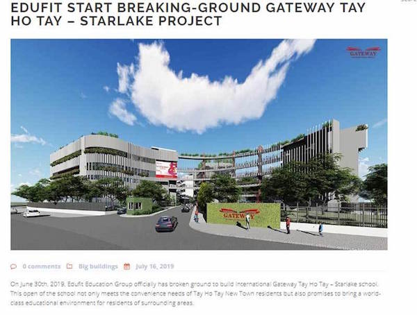 Còn theo chủ dự án Dự án Khu trung tâm Khu đô thị Tây Hồ Tây (Starlake) Công ty TNHH Phát triển THT, cuối tháng 6/2019 Tập đoàn Edufit (Edufit Education Group) của bà Trần Thị Hồng Hạnh đã khởi công Trường quốc tế Gateway Tây Hồ Tây (International Gateway Tay Ho Tay - Starlake School) tại khu đô thị này.