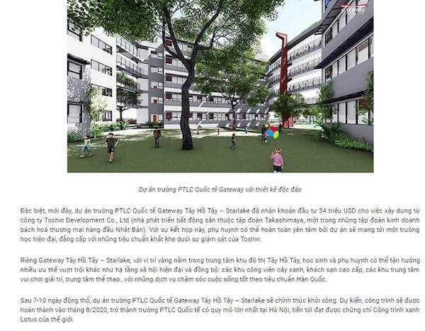 Thông tin từ Gateway International School, dự án trường phổ thông liên cấp quốc tế Gateway Tây Hồ Tây - Starlake đã nhận được khoản đầu tư 34 triệu USD (800 tỷ đồng) từ nhà bất động sản Toshin Development Co., Ltd, thuộc tập đoàn kinh doanh thương mại hàng đầu Nhật Bản Takashimaya.