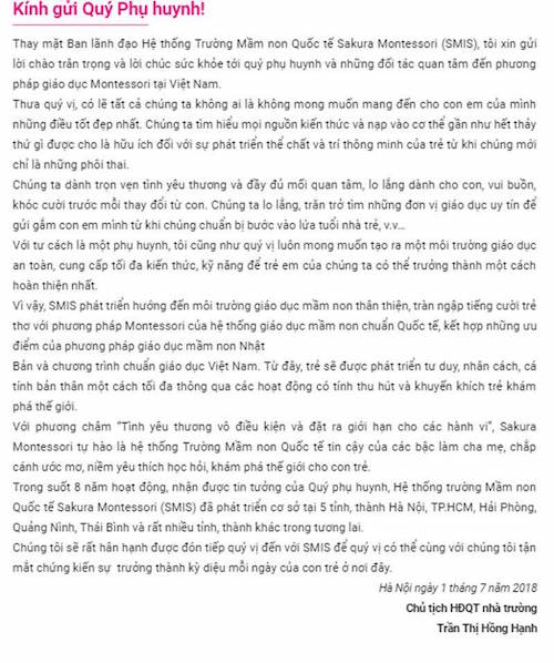 Bà Trần Thị Hồng Hạnh khẳng định sự an toàn trong hệ thống giáo dục của mình.