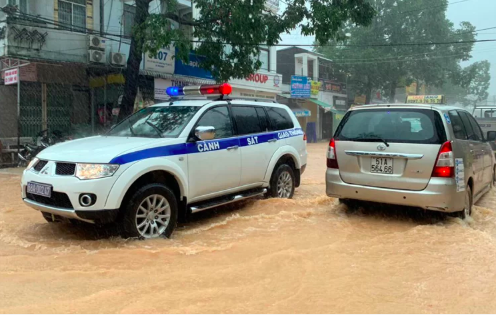 Nhiều xe CSGT liên tục xuất hiện trên các tuyến đường ở thị trấn Dương Đông đang mưa rất lớn, lưu ý người dân không vào vùng nguy hiểm. Ảnh: Nguyễn Dung.