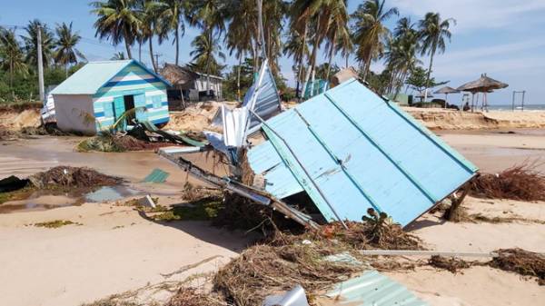 Kèm theo đó, mái của những hàng quán bị gió đá_n_h bay nằm rải rác trên mặt nước, có căn nhà bị sụp do lở đất, hàng chục chiếc dù bằng tranh lá vốn là nơi cho du khách nằm ngắm biển cũng bị đá_n_h bật lên, nằm nghiêng ngả, hàng loạt hàng rào bằng tôn bị gió cuốn cong.
