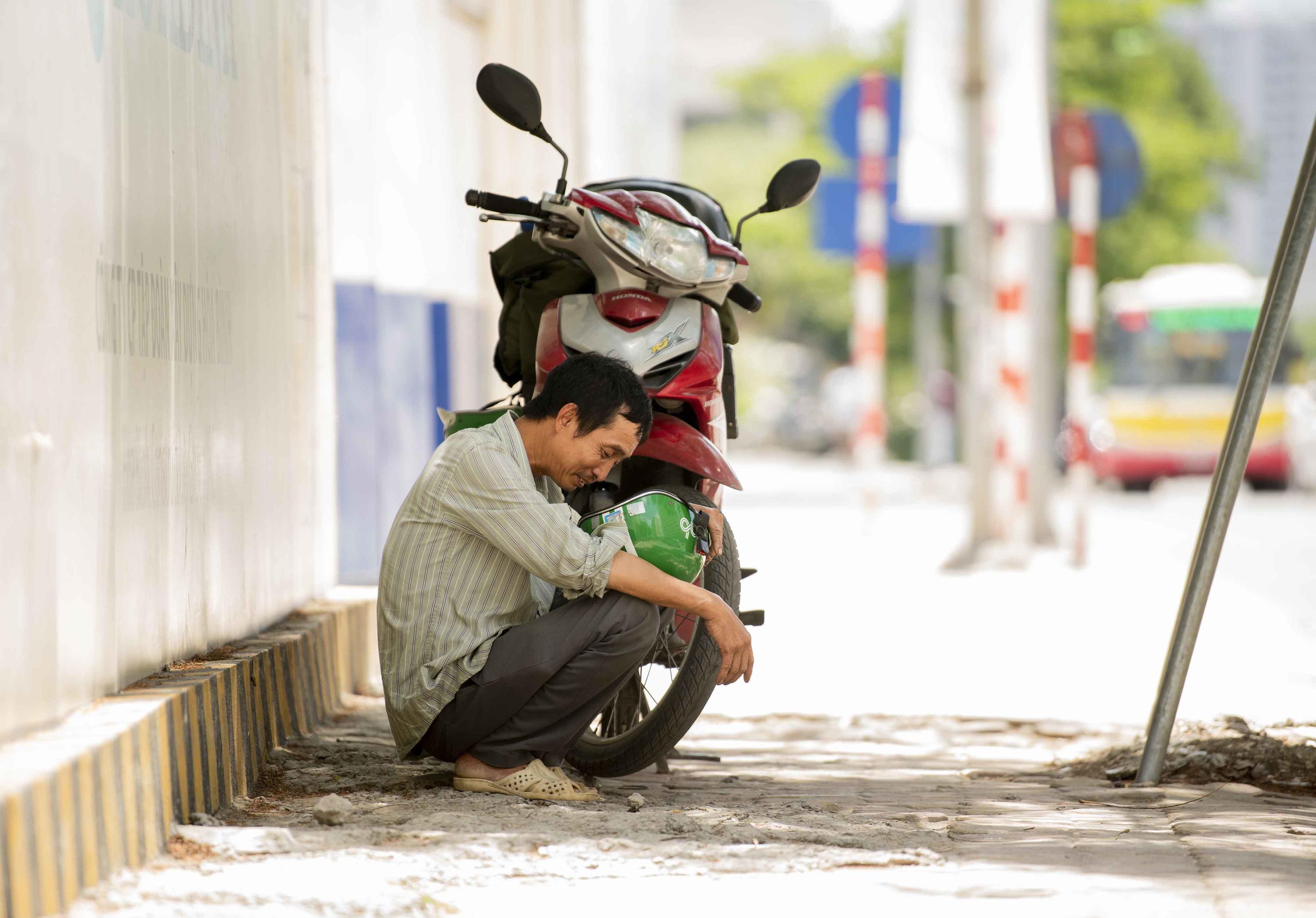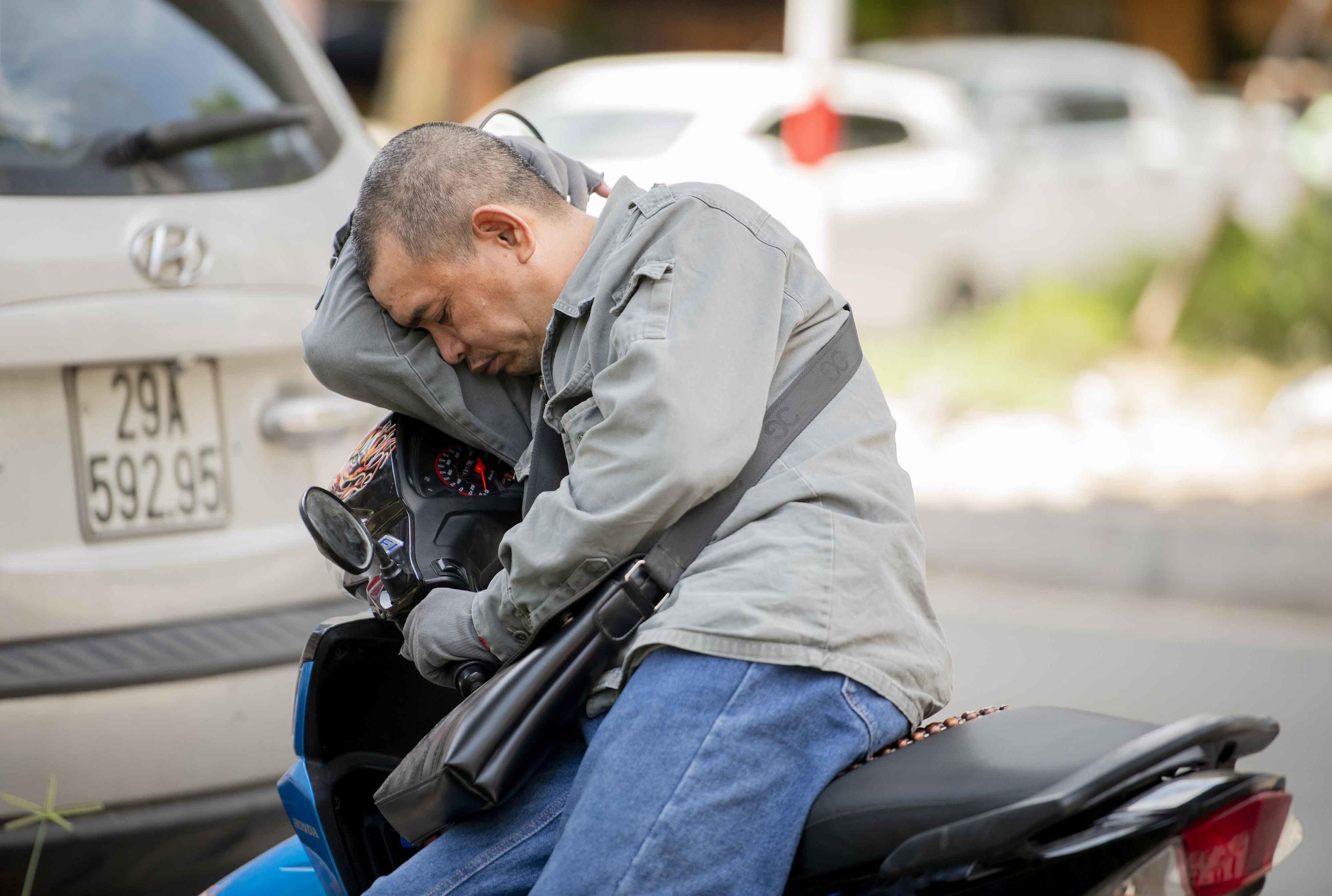 Nắng vào buổi trưa bỏng rát khiến một bác lái xe ôm phải dừng xe bên lề đường để nghỉ ngơi.