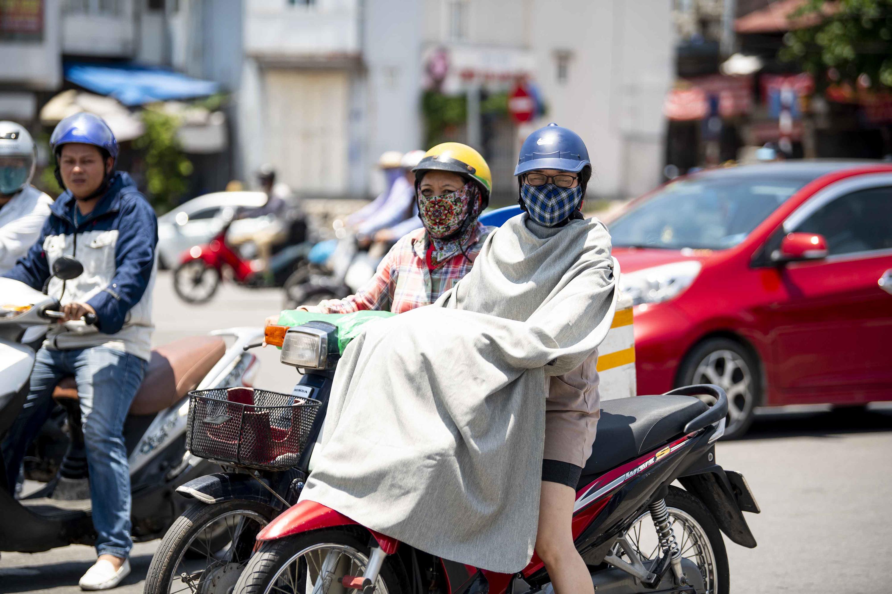 Một phụ nữ đi xe máy dùng nguyên cái chăn để chống nắng khi tham gia giao thông giữa trời nắng 38 độ.
