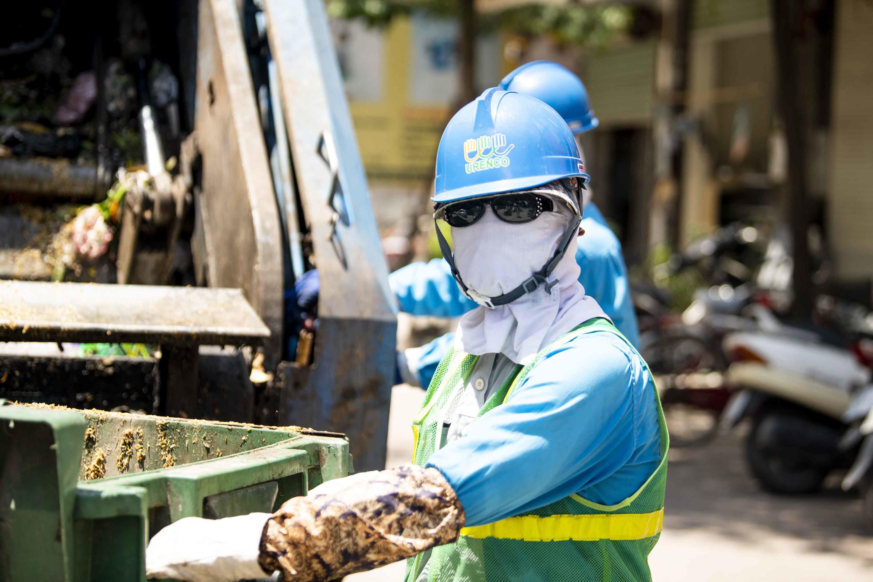 Dưới cái nắng gắt 38 độ, những công nhân vệ sinh môi trường vẫn miệt mài công việc.